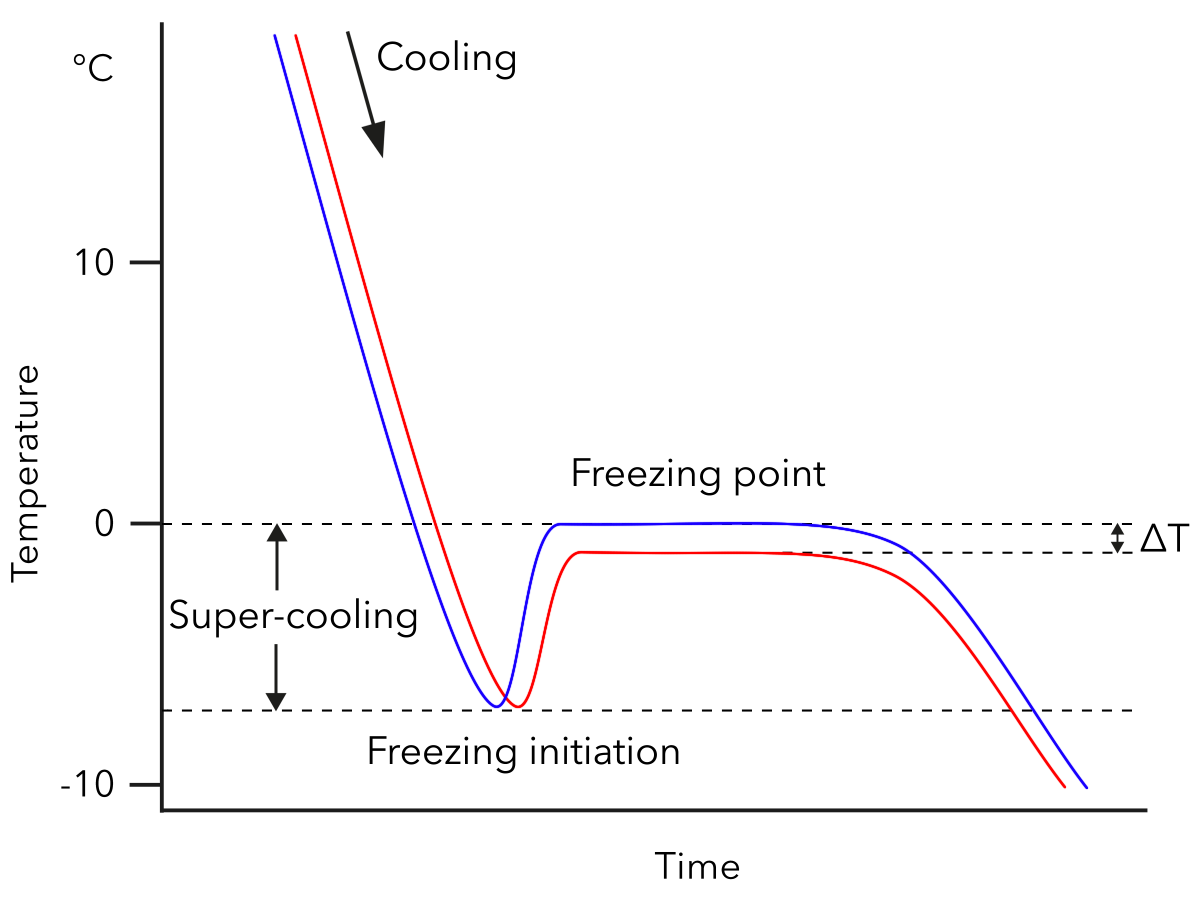 藍(lán)色線條代表純水,紅色線條為牛奶,△T即為牛奶的實(shí)測(cè)冰點(diǎn)值