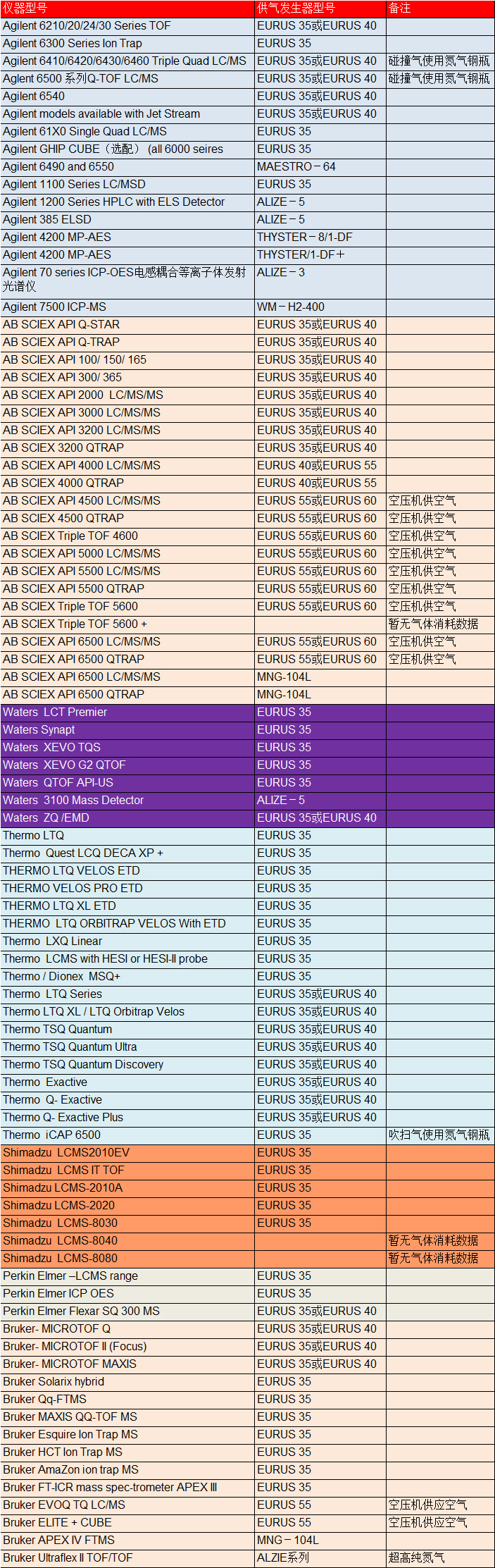 主要儀器型號(hào)與發(fā)生器型號(hào)匹配方案