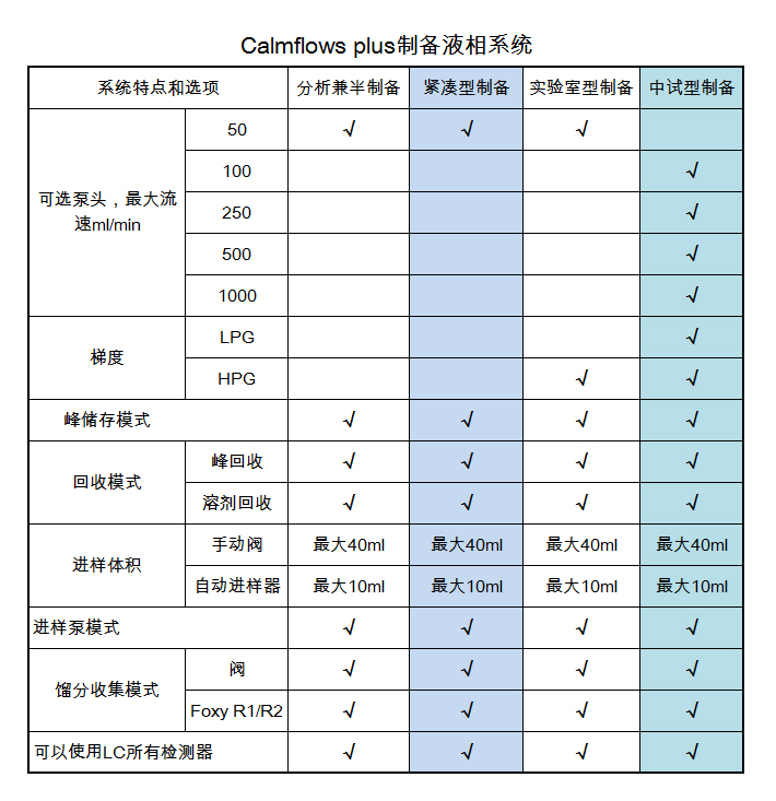 Calmflow plus系列制備液相色譜系統(tǒng),從分析兼半制備、緊湊型半制備、實驗室型循環(huán)制備到中試型循環(huán)制備的可選部件規(guī)格如下。