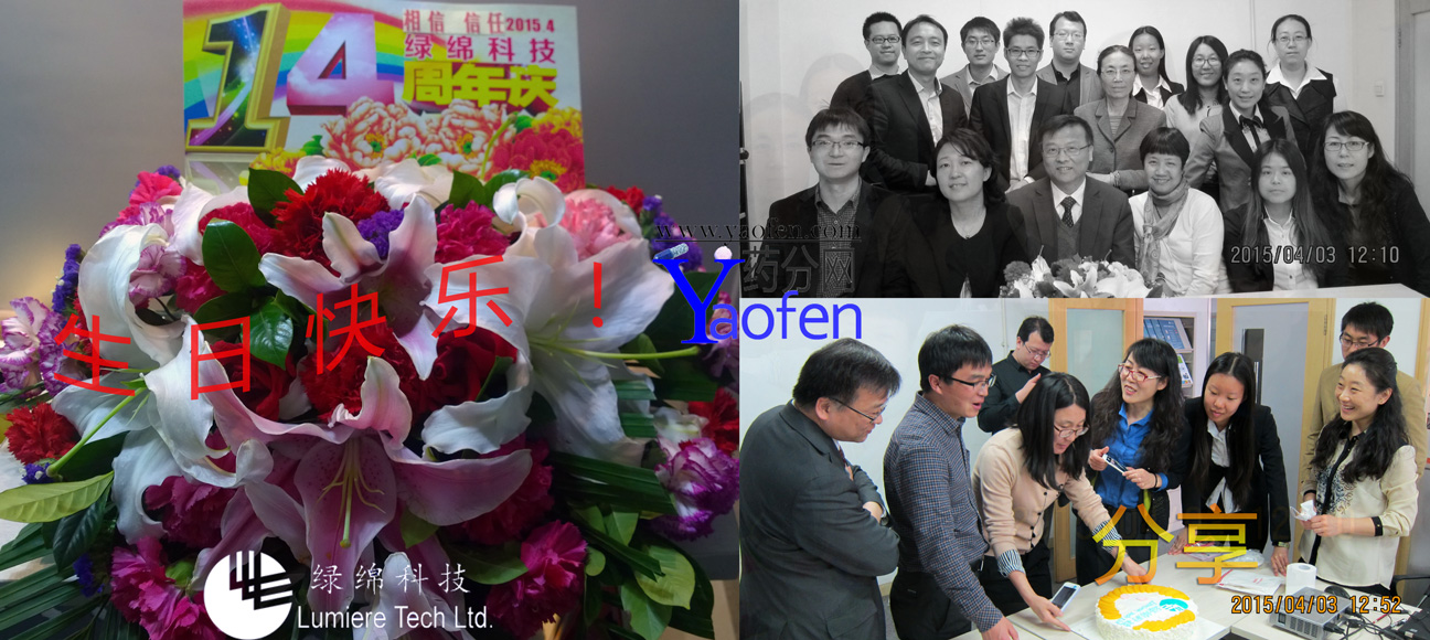 2015年4月3日綠綿科技員工在北京辦公室一起分享綠綿科技成立十四周年的喜悅。