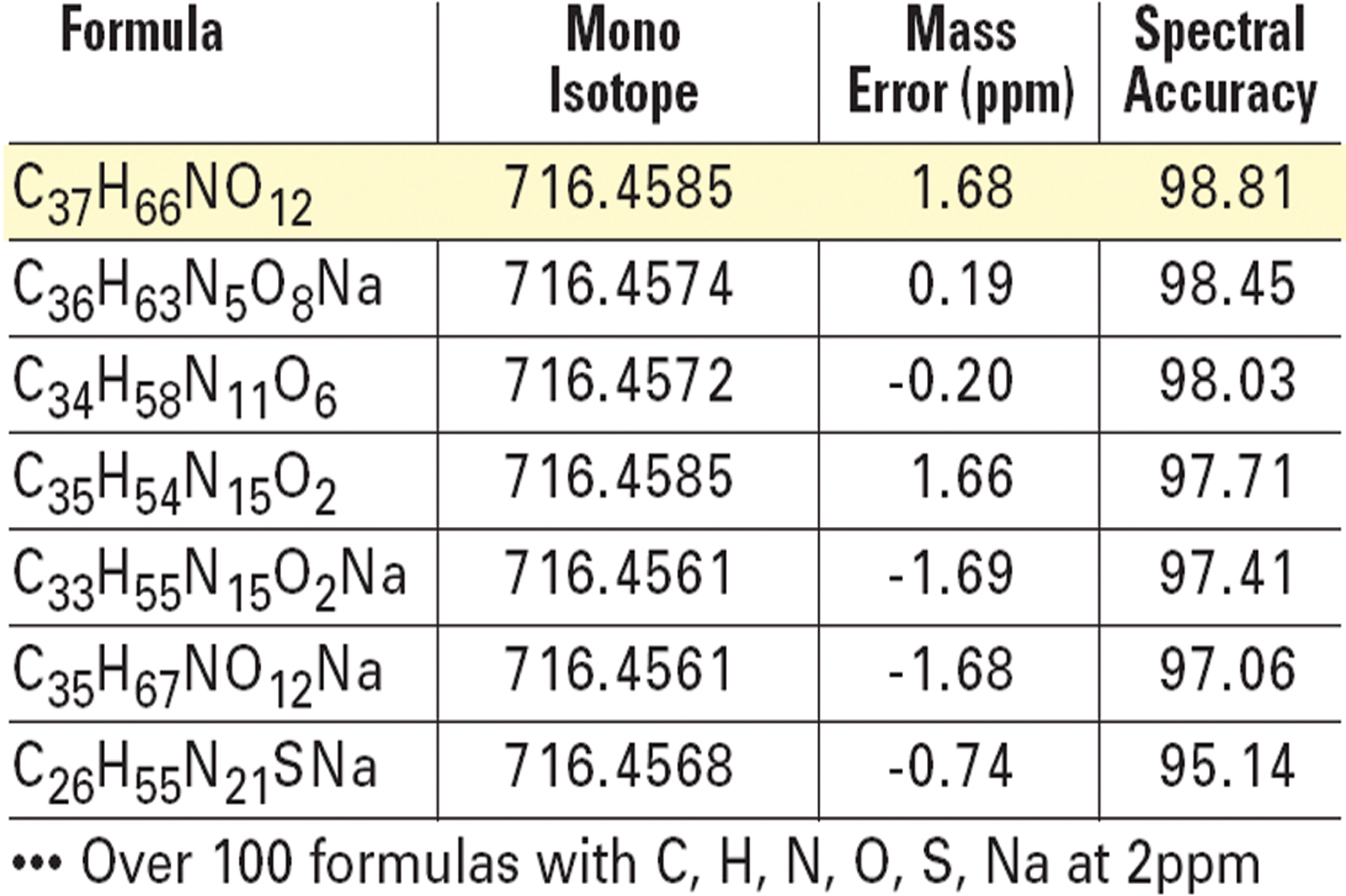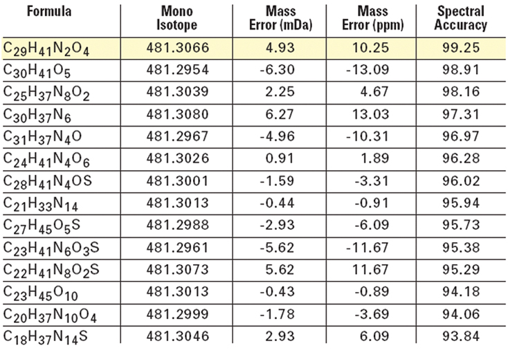 表1. 來(lái)自TOF儀器,并根據(jù)譜圖準(zhǔn)確度排列得到的依米丁(C29H41N2O4+)的搜索列表(利用C、H、N、O和S元素搜索得到的179個(gè)分子式)。表明MassWorks的sCLIPS很容易識(shí)別小到千分之幾的譜圖差異,這對(duì)于未經(jīng)適當(dāng)線形譜圖校正是不可能的。也應(yīng)該注意到,儀器盡管沒(méi)有很好的校正,譜圖準(zhǔn)確度在質(zhì)量精度超過(guò)10 ppm時(shí),也很容易實(shí)現(xiàn)正確的分子式識(shí)別。