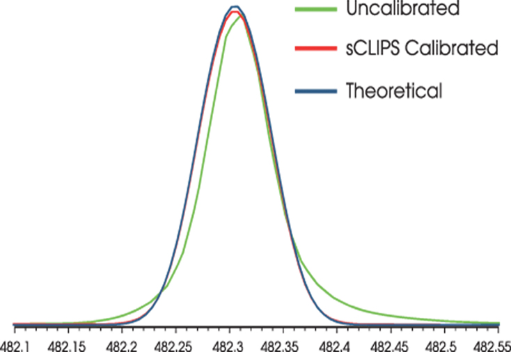 MassWorks軟件的sCLIPS通過(guò)將質(zhì)譜的線形校正為可用數(shù)學(xué)表達(dá)的函數(shù),地解決了這個(gè)問(wèn)題,可以利用譜圖準(zhǔn)確度值,非常地對(duì)比校正譜圖與理論譜圖,實(shí)現(xiàn)未知離子分子式的識(shí)別。sCLIPS充分利用了未知離子的單同位素峰與其它同位素峰很好分離的特點(diǎn),不需要使用內(nèi)標(biāo)或外標(biāo),直接得到測(cè)量的峰形函數(shù),通過(guò)MassWorks產(chǎn)生單同位素峰的線形校正函數(shù),并將其應(yīng)用到離子的整個(gè)同位素輪廓。這個(gè)線形校正譜圖,能夠可視和定量地與用相同的線形函數(shù)計(jì)算得到的理論譜圖進(jìn)行比較。得到的譜圖準(zhǔn)確度值提供了準(zhǔn)確和強(qiáng)大的計(jì)量工具,能從質(zhì)量得到的長(zhǎng)長(zhǎng)可能分子式列表中得到正確的分子式。