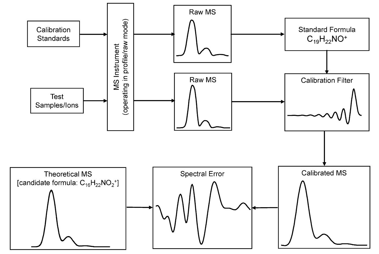圖示:在單位分辨率質(zhì)譜上運(yùn)用綜合的質(zhì)量校正方法和譜圖準(zhǔn)確度計(jì)算