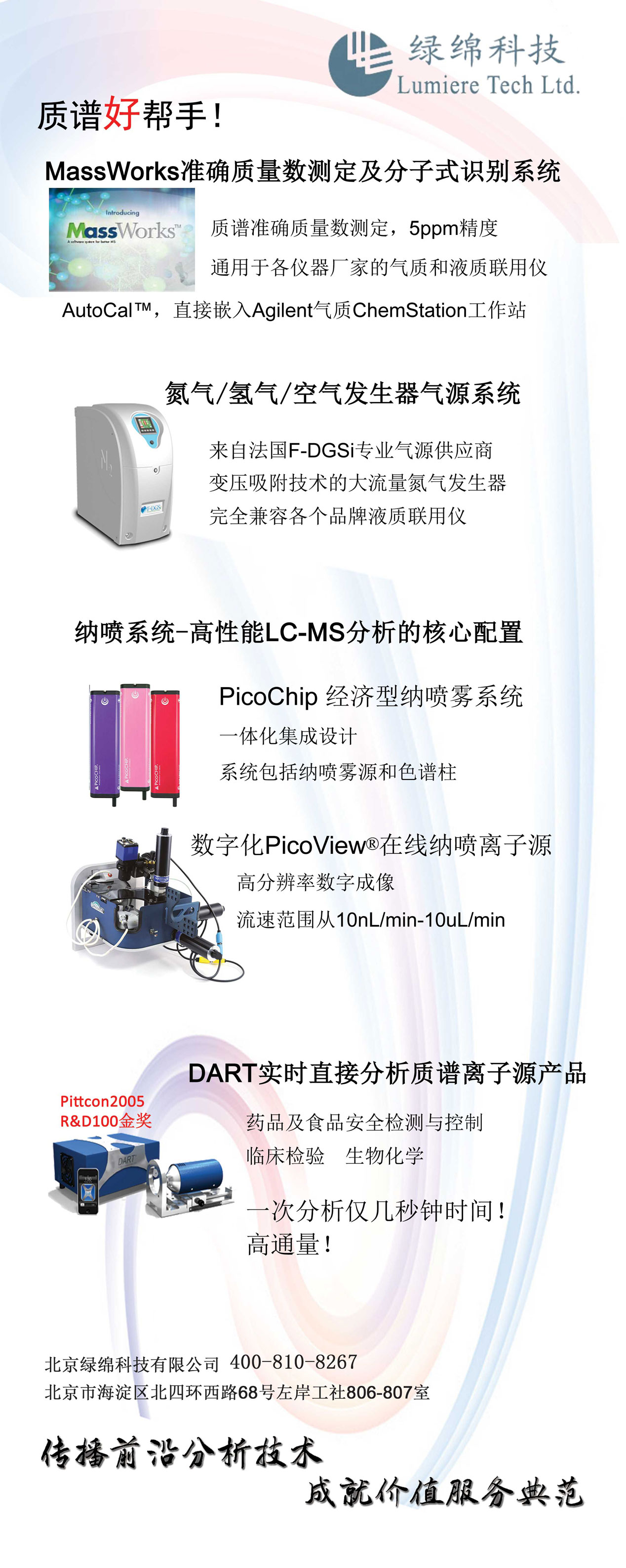 四、綠綿科技在2014第三屆環(huán)渤海區(qū)域色譜質(zhì)譜學(xué)術(shù)會(huì)議展出質(zhì)譜好幫手:安捷倫科技旗下GC/MSD系統(tǒng)上配置Cerno Bioscience校正和分析軟件MassWorks,綠綿科技推出的實(shí)驗(yàn)室氣源系統(tǒng)可以給所有廠家液質(zhì)提供穩(wěn)定的氣源,PicoChip一體化集成設(shè)計(jì)完整經(jīng)濟(jì)的納噴霧系統(tǒng),PicoChip系統(tǒng)包括PicoChip納噴霧源和PicoChip色譜柱,數(shù)字型PicoView®納噴離子源數(shù)字控制消除了手動(dòng)噴針定位和電壓調(diào)整的繁瑣和偏差,是提升LC-MS性能的利器,DART基本不需要樣品制備,樣品分析時(shí)間很短(幾秒鐘),滿足了現(xiàn)代社會(huì)對(duì)高通量樣品快速分析的需求。