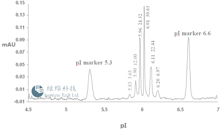·每 0.5 pH單位有一個(gè)marker,有足夠的marker和樣品峰盡量近,保證pI校正的重復(fù)性和準(zhǔn)確性