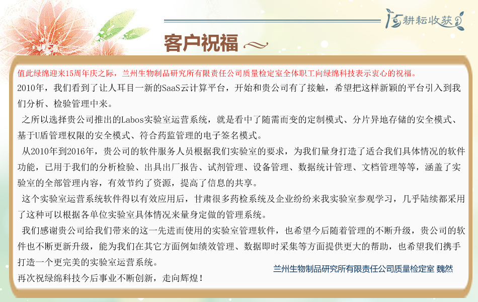 綠綿科技在15年耕耘于實(shí)驗(yàn)室,傳播國(guó)外先進(jìn)的分析技術(shù),服務(wù)于客戶提高分析檢測(cè)的效率和水平,綠綿科技的用戶也發(fā)來(lái)寄語(yǔ),祝福綠綿科技十五年風(fēng)雨,十五載耕耘,如今的綠綿科技已經(jīng)碩果累累,值此十五歲生日之際,恭祝綠綿科技今后的發(fā)展之路更加順利,事業(yè)更加輝煌!從一簇綠色嫩芽成長(zhǎng)為綠色延綿的林蔭。有感于綠綿科技15年成長(zhǎng)歷程。祝綠綿科技茁壯成長(zhǎng)為覆蓋全球綠色森林!
