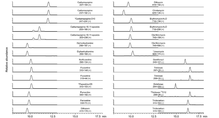 作者的文章《農業(yè)土壤中接收污泥的藥物和個人護理用品(PPCPs)的檢測應用》前處理萃取使用了Biotage的6ml,200mg的EVOLUTE ABN小柱,氮吹定容到2mL,-20度保存。LC/MS/MS的測定譜圖如下: