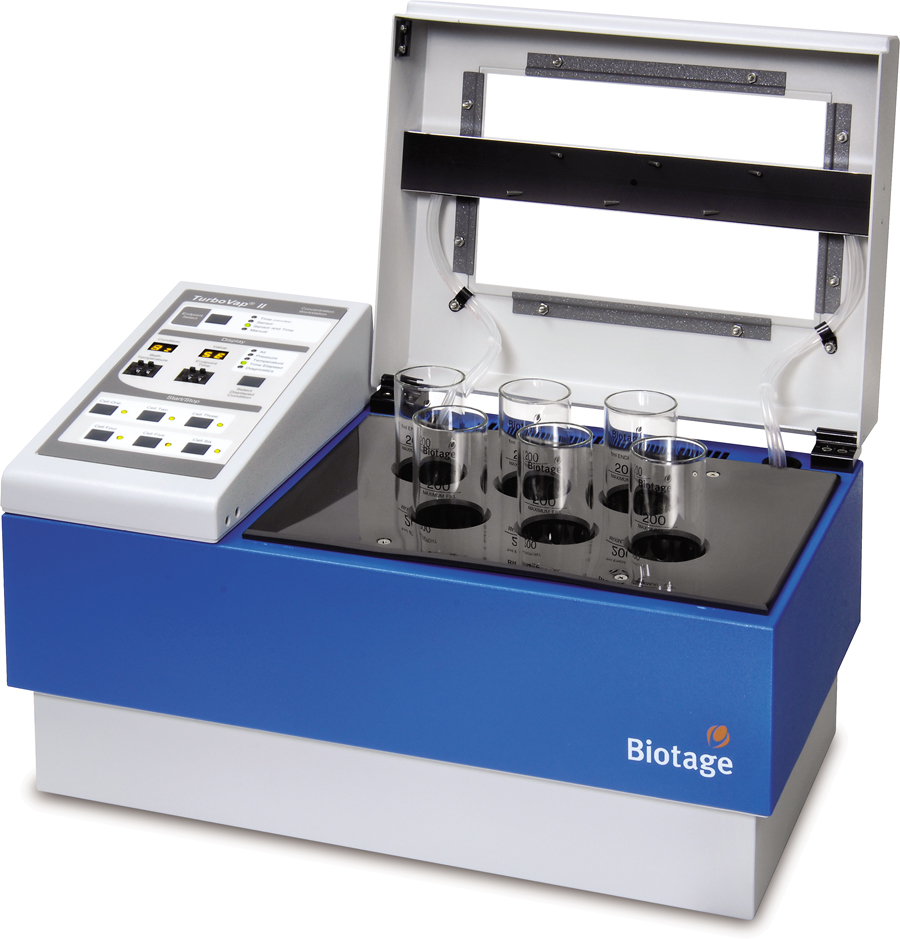 《探討水中內分泌活性藥物對魚類影響的分析方法》一文作者使用了Biotage TurboVAP II進行濃縮到,23度10 psi氮氣到0.5mL,溶劑轉換為乙腈2mL,4度保存,LCMSMS進行測定內分泌活性藥物(EPAs)和代謝物。