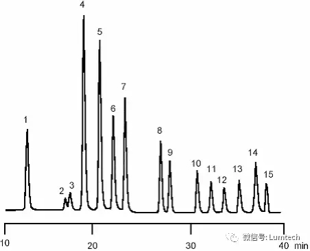 色譜圖:1. 萘 2. 苊 3. 芴 4. 菲 5. 蒽 6. 熒蒽 7. 芘 8. 苯(a)蒽 9. 草屈 10. 苯(b)熒蒽 11. 苯(k) 熒蒽 12. 苯(a) 芘 13. 二苯(a,h)蒽 14. 苯(g,h,i)二萘嵌苯 15. 茚酚(1,2,3-cd) 芘