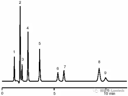 色譜圖: 1. 維生素C 2. 乙酰舒泛K 3. 糖精 4. 咖啡因 5. 天(門(mén))冬氨酰苯丙氨酸甲酯 6. 奎寧 7. 香蘭 酮 8. 山梨酸 9. 安息香酸
