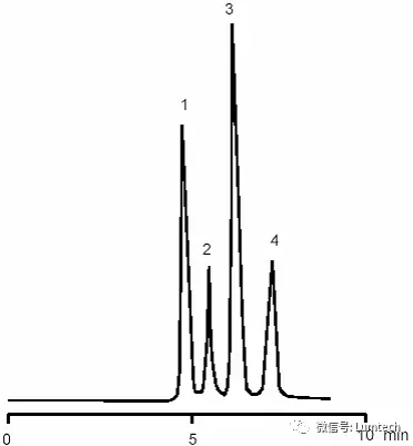 色譜圖:1. 黃曲霉毒素G2 2.黃曲霉毒素G1 3.黃曲霉毒素B2 4.黃曲霉毒素B