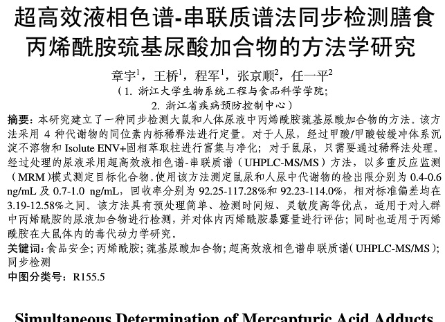 使用Isolute_ENV+SPE柱富集和凈化樣品研究膳食丙烯酰胺巰基尿酸加合物