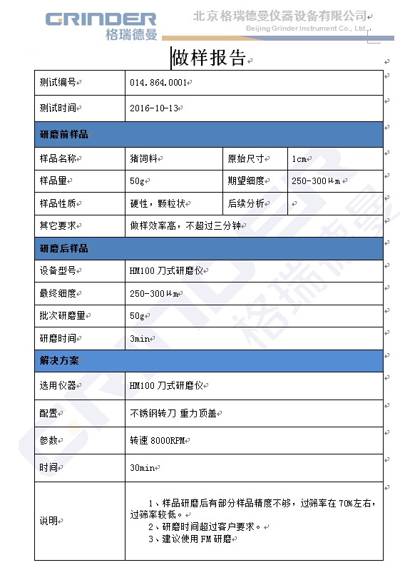 關(guān)鍵詞:豬飼料、研磨、HM100、前處理、綠綿科技、格瑞德曼、報(bào)告