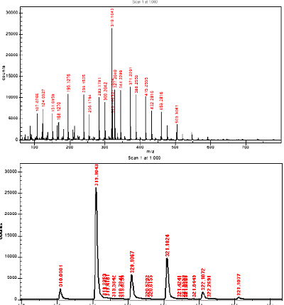 圖1. 一個(gè)平均的AccuTOF DART MS譜圖(頂圖 -- 完全的MS譜圖;底圖 -- 319 Da未知離子的譜圖部分)