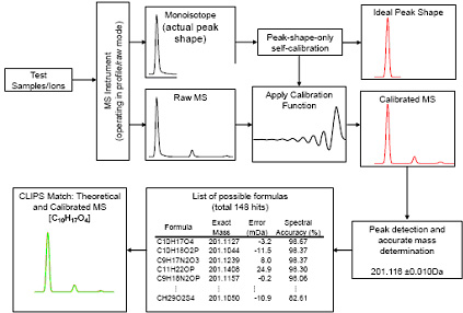 圖2. 高分辨MS系統(tǒng)用于分子式測定的MassWorks sCLIPS通常數(shù)據(jù)處理流程 一旦得到僅包含峰形的校正函數(shù)--有效地將實(shí)際峰形函數(shù)轉(zhuǎn)換為理想(已知的、對(duì)稱的和可用數(shù)學(xué)表達(dá)的)峰形函數(shù),這個(gè)校正函數(shù)然后被用于到整個(gè)同位素輪廓圖,包括其余的同位素峰,得到一個(gè)校正的同位素輪廓圖。雖受隨機(jī)噪音和其它測量條件(如檢測器飽和)或數(shù)學(xué)誤差影響,但這個(gè)校正后的同位素輪廓圖本質(zhì)上應(yīng)該與正確分子式的理論計(jì)算譜圖是一樣的,換句話說,作為下面定義的譜圖準(zhǔn)確度應(yīng)該接近100.00%。