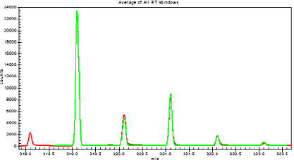 圖5顯示了校正后譜圖與排名第二分子式(C15H24O3SCl )的譜圖匹配,該分子式僅有15個(gè)碳,譜圖準(zhǔn)確度為96.52%,顯示在320 Da峰上的輕微不同,再一次表說明了用已知峰形函數(shù)對(duì)真正同位素輪廓建模的重要性。有趣的是,在表1的可能分子式列表中,排在頂部的待選分子具有氮元素,說明這種疊加質(zhì)譜圖能作為分子式可能元素檢測的有效工具用。