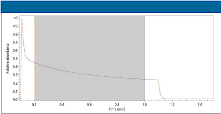 EI廣泛用于氣相色譜-質(zhì)譜(GC-MS),在EI過程中,分子離子常常被碎裂成多個(gè)碎片離子,盡管樣品所測得的質(zhì)核比(m/z)和譜庫比較僅有±0.5 Da準(zhǔn)確度,但這些EI碎片離子通過譜庫檢索(如NIST)可以提高MS的化合物識別能力,因此,EI譜庫檢索已經(jīng)成為GC-MS化合物識別的選擇方法。雖然該方法可以很好地滿足一些日常應(yīng)用,但如果很多化合物具有相似的高檢索分?jǐn)?shù)時(shí),化合物識別就變得含糊不清了。在一些苛刻應(yīng)用中,如雜質(zhì)和降解物識別,藥物、化學(xué)品、食品和香精、香料行業(yè)中的活性組分測定,這些不明化合物可能不在譜庫中,因此,這類應(yīng)用就需要高分辨質(zhì)譜系統(tǒng)如GC-TOF測量質(zhì)量數(shù),這類儀器是非常昂貴的,而且需要更高的維護(hù)費(fèi)用。質(zhì)量測定可以進(jìn)一步確定譜庫搜索結(jié)果,或通過分子離子及重要的碎片離子確定元素組成。 在另一篇文章中,Chen及其團(tuán)隊(duì)[1]報(bào)道了通過新的校正方式,精密地校正了m/z和質(zhì)譜的線形譜圖,在傳統(tǒng)四極桿GC-MS系統(tǒng)上實(shí)現(xiàn)了極高的質(zhì)量測定。由于這個(gè)精密設(shè)計(jì)的校正方式涉及質(zhì)量準(zhǔn)確度和譜圖準(zhǔn)確度,關(guān)于這個(gè)校正及其實(shí)際應(yīng)用的穩(wěn)定性問題隨之出現(xiàn)。 本文針對傳統(tǒng)單四極桿GC-MS系統(tǒng)元素組成識別的影響因素,質(zhì)量準(zhǔn)確度和譜圖準(zhǔn)確度兩個(gè)方面,設(shè)計(jì)一個(gè)校正穩(wěn)定性研究程序并將結(jié)果展現(xiàn)給大家。 原理 傳統(tǒng)的質(zhì)譜校正僅確定質(zhì)量數(shù),而不考慮儀器線形譜圖,儀器線形譜圖大大影響質(zhì)量數(shù)測定,特別是在單位質(zhì)量分辨儀器如四極桿GC-MS系統(tǒng)。開發(fā)的新校正方式[2, 3]不僅校正了質(zhì)量軸,而且也校正了儀器的線形譜圖,由于質(zhì)譜的理論峰位(它們是相關(guān)離子的質(zhì)量和)可以非常準(zhǔn)確的知道,另外,我們也可以準(zhǔn)確地知道不同同位素及其豐度,通過這些信息可以計(jì)算出校正函數(shù),不但校正峰的位置,而且也校正儀器的線形譜圖。 實(shí)際儀器的線形譜圖常常是未知且很難定義,通過這個(gè)新技術(shù)校正后,變成對稱且可用數(shù)學(xué)表達(dá)的線形函數(shù),這就大大提高了后續(xù)處理能力,包括在單四極桿GC-MS儀器上質(zhì)量數(shù)測定能力。通常來說,利用報(bào)告的質(zhì)量信息,在一定的質(zhì)量偏差內(nèi),通過搜索全部可能的化學(xué)分子式可以確定元素組成。依賴儀器內(nèi)在的質(zhì)量準(zhǔn)確度,在質(zhì)量偏差范圍內(nèi)得到的分子式均為可能的分子式,如質(zhì)量準(zhǔn)確度達(dá)到1 ppm的儀器,對于500 Da的化合物,限定元素為C、H、N、O、S和Cl時(shí),待選的化合物有34個(gè)。 眾所周知,每個(gè)分子式具有的同位素分布,理論上來說,這個(gè)同位素分布可作為分子式識別的附加信息。以前,這個(gè)方式用于分子式識別被認(rèn)為是不可行的,因?yàn)楹茈y在給定的儀器上將同位素輪廓圖校正到高于98%的譜圖準(zhǔn)確度[4],這就限制了使用同位素輪廓圖信息,幫助我們減少通過質(zhì)量測定得到的待選化合物數(shù)量。然而,如果譜圖準(zhǔn)確度能夠提高到99%以上,它就能在質(zhì)量數(shù)得到可能分子式列表中識別出的分子式,或在不經(jīng)常校正的儀器上測定確定的分子式,只要能保證相對較高的質(zhì)量精度。 利用前面描述的儀器校正線形函數(shù),列表中每個(gè)待選化合物的理論質(zhì)譜圖可以準(zhǔn)確計(jì)算出來,并將其分別與先前校正的測量質(zhì)譜圖比較,高于99%的譜圖準(zhǔn)確度值被計(jì)算出來,用于反映兩者微小且基本不同,然后對給出分子式的可能性進(jìn)行排名,這個(gè)過程叫做校正的線形同位素輪廓搜索(CLIPS),已經(jīng)證明,CLIPS對于分子式測定優(yōu)于質(zhì)量準(zhǔn)確度。 實(shí)驗(yàn) 全氟三丁胺(PFTBA)校正標(biāo)樣和樣品混合物在Agilent 5973 GC-MS單四極桿系統(tǒng)上測試一周,PFTBA標(biāo)樣通過注射法測試一次,且在一周后實(shí)驗(yàn)結(jié)束時(shí)重復(fù)測試一次,混合樣品在兩次PFTBA運(yùn)行中間,以不同濃度分析22次,在這個(gè)分析過程中,利用MassWorks CLIPS (Cerno Bioscience, Danbury, Connecticut)測試盲樣(名義質(zhì)量數(shù)m/z 162)并確定其元素組成。PFTBA和混合樣品在相同MS條件,“raw”模式(非峰檢測,有時(shí)叫做輪廓模式)、質(zhì)量范圍為50-550 m/z且離子閾值為零下采集。 利用次PFTBA運(yùn)行的八個(gè)已知碎片離子,校正全部22次GC-MS運(yùn)行,并計(jì)算盲樣的質(zhì)量數(shù)并確定元素組成,這個(gè)校正也應(yīng)用到第二次PFTBA運(yùn)行,測定同樣八個(gè)碎片離子的質(zhì)量,以測定兩次PFTBA運(yùn)行期間的質(zhì)量漂移。 結(jié)果和討論 圖1顯示了次PFTBA運(yùn)行的總離子流圖,0.8 min的保留時(shí)間窗口用于校正前的譜圖平均。圖2顯示了校正離子C3F5+校正前后的輪廓模式質(zhì)譜圖,表明雖然經(jīng)過很好的調(diào)諧,但質(zhì)譜的輪廓圖沒有已知且可定義的峰形,而校正后的譜圖具有已知且可用數(shù)學(xué)表達(dá)的峰形,校正的質(zhì)譜圖也根據(jù)校正離子的單同位素質(zhì)量平移到正確的質(zhì)量數(shù)位置。由于慣例且不失