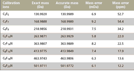 圖2. PFTBA校正離子(C3F5+)校正前(黑)后(紅)的質(zhì)譜數(shù)據(jù) 這個(gè)校正被應(yīng)用在一周后的第二次PFTBA運(yùn)行上,表I列出了同樣八個(gè)校正離子的質(zhì)量數(shù),可以發(fā)現(xiàn)全部這些離子的系統(tǒng)質(zhì)量漂移約+7 mDa,折合為12- 54 ppm,這個(gè)誤差用于傳統(tǒng)的單一同位素質(zhì)量搜索確定元素組成常常認(rèn)為是太大的。 表I. 后一天校正離子PFTBA數(shù)據(jù)采集處理后得到的質(zhì)量數(shù)