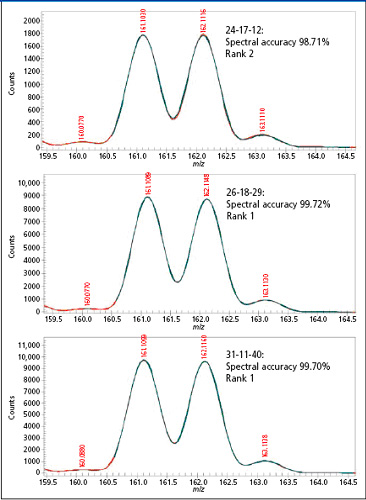 圖4. m/z 162(煙堿,分子式C10H14N2,真實(shí)質(zhì)量為162.1157 Da)離子識別 取三次運(yùn)行(24-17-12、26-18-29和31-11-40)作為例子與理論計(jì)算煙堿質(zhì)譜圖進(jìn)行疊加(圖5),發(fā)現(xiàn)在低濃度運(yùn)行(24-17-12)時(shí)得到好的譜圖匹配,在更高濃度運(yùn)行(26-18-29和31-11-40)得到幾乎的譜圖匹配,這些都反應(yīng)在相應(yīng)的譜圖準(zhǔn)確度這個(gè)度量工具上。圖5說明譜圖準(zhǔn)確度直接同離子信號強(qiáng)度(噪音數(shù)據(jù))相關(guān),幾乎與時(shí)間或質(zhì)量漂移無關(guān),表明譜圖準(zhǔn)確度不僅是有價(jià)值的信息,而且是更可靠的分子式識別手段。 圖5描繪了162 Da煙堿離子的質(zhì)譜片斷,161 Da質(zhì)譜峰與煙堿離子具有相同的離子強(qiáng)度,因?yàn)?span lang="EN-US">GC-MS和串聯(lián)MS-MS實(shí)驗(yàn)中,在離子化-碎裂過程中常常有其它離子或碎片引起同位素響應(yīng)疊加,這樣的質(zhì)譜干擾引起162 Da離子系統(tǒng)質(zhì)量測量誤差,圖3的負(fù)質(zhì)量測量偏差就是充分證據(jù)。但這不會影響計(jì)算的譜圖準(zhǔn)確度,因?yàn)?span lang="EN-US">m/z 161 Da