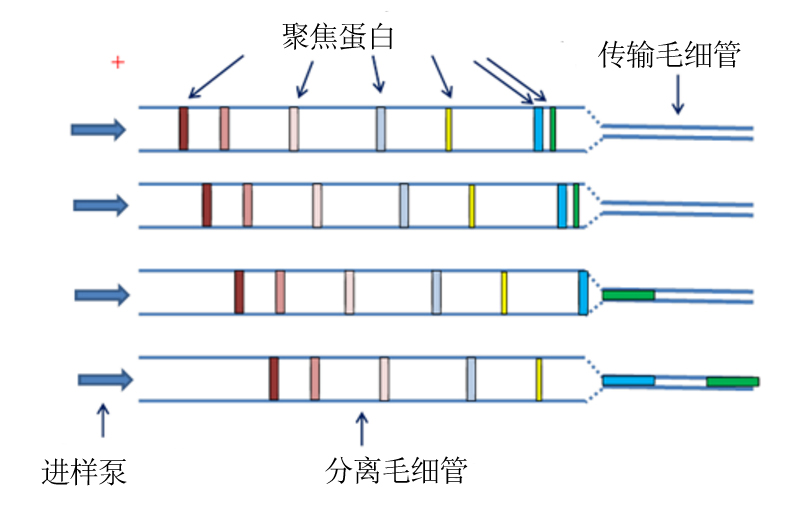 5) 全柱成像檢測(cè)應(yīng)用于毛細(xì)管等電聚焦,可以取消樣品聚焦區(qū)帶的移動(dòng)步驟,充分保持毛細(xì)管等電聚焦的高分離柱效和高分辨率